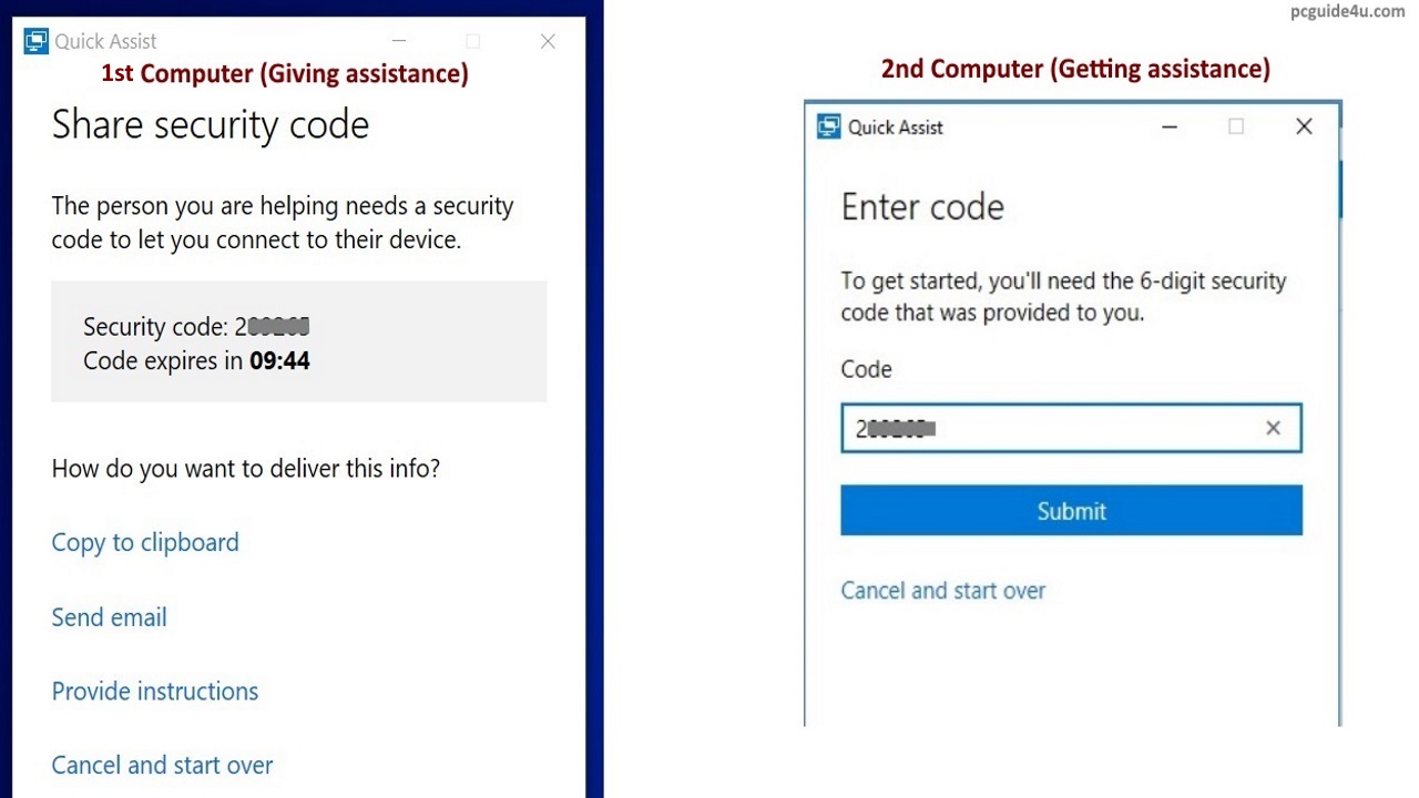Once you click on Give assistance, you will receive a six (6) digit security code and this code is valid for only 10 minutes. After that, the code will expire and is not valid to establish a connection after 10 minutes.