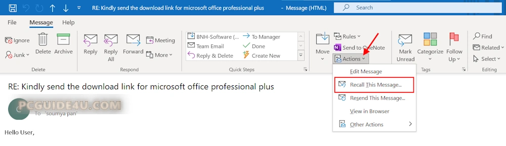 - Select Recall This Message from the dropdown menu. By clicking on this option, you will initiate the message recall process.