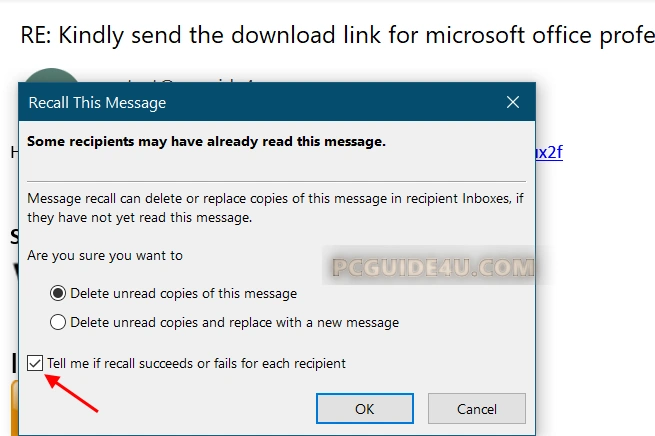 Click on the OK button to initiate the recall. You this action on Outlook will now attempt to recall the message and inform you of the outcome.