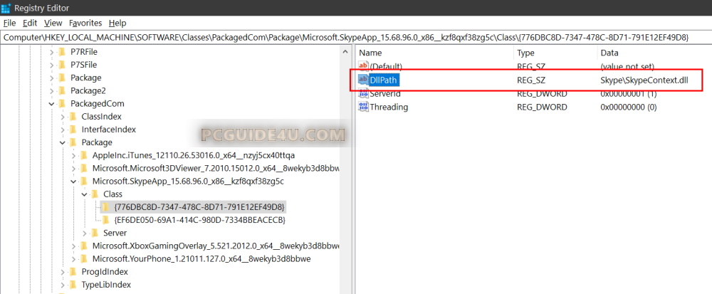 Step 5. The moment you have selected the key {776DBC8D-7347-478C-8D71-791E12EF49D8}, in the right pane, look for string value DllPath which contains the data value Skype\SkypeContext.dll