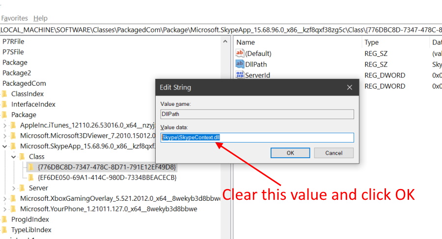 Step 6. In order to remove Share with Skype option, double click on DllPath string and delete or clear the value Skype\SkypeContext.dll and click OK to save settings.