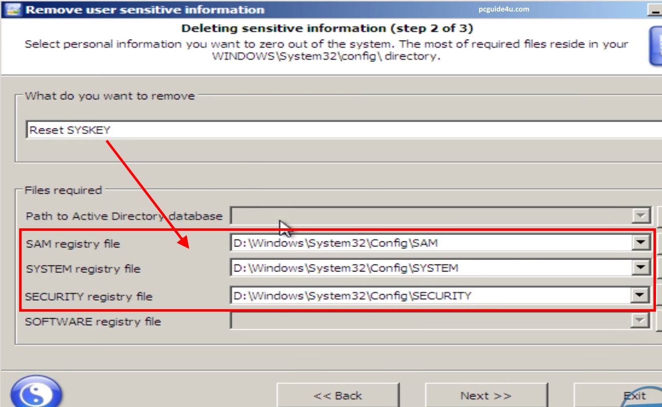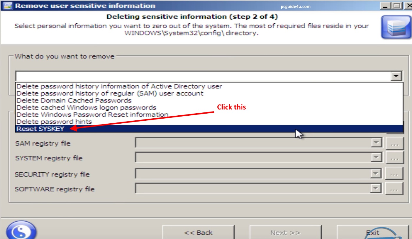 Step 2. On the next screen, under “What do you want to remove” select Reset SYSKEY from the drop-down list and click Next.