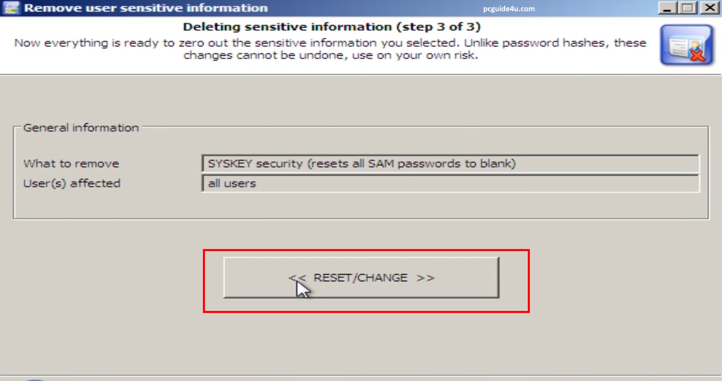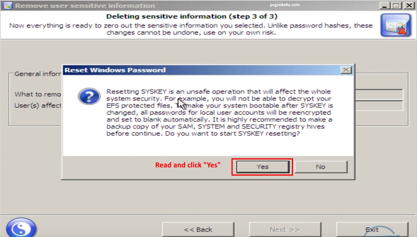 Step 5. A window will be prompted to confirm, read and click on Yes in order to reset SYSKEY password. This will initiate a small process and will be completed in seconds.