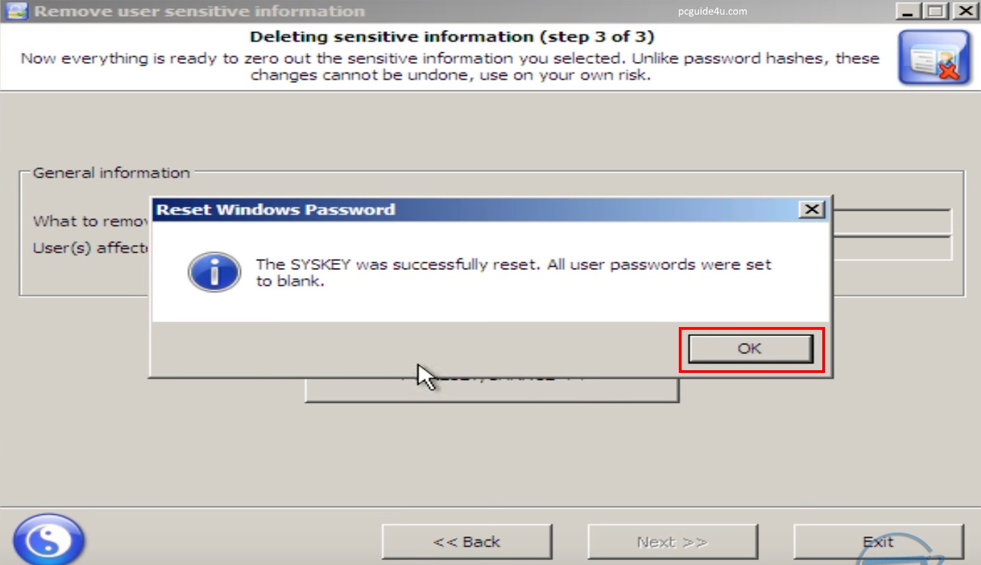Step 6. Lastly, you will be getting the message that the SYSKEY was successfully reset.