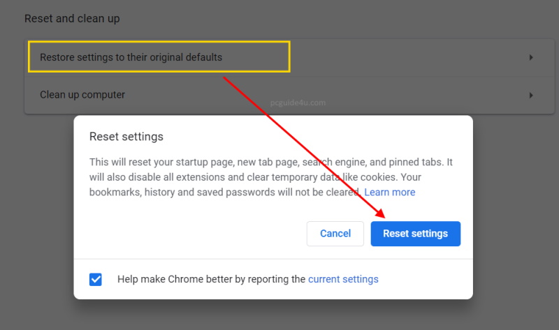 Restore settings to their original defaults: if you click on this option, another window will be prompted with options Cancel and Reset settings.