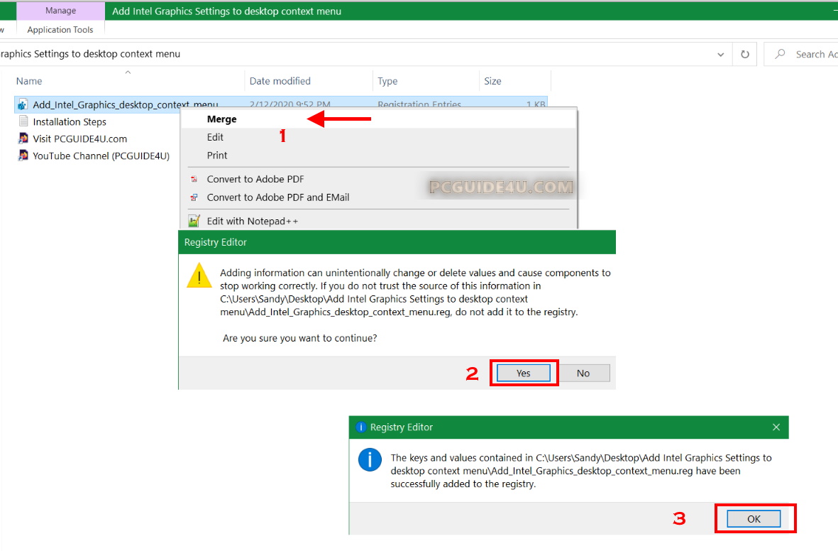 - Double click and open the folder. Right-click on ‘Add_Intel_Graphics_desktop_context_menu.reg’ and select Merge. You may get prompted for authentication. Click Yes to continue
