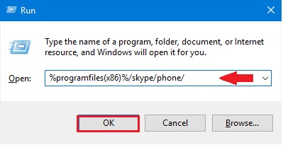 In case, if you get an error, try again, but this time type in a bit different command following %programfiles%/skype/phone/ in the Run window and hit the OK button to open.