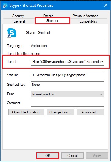 The Target field should now “C:\Program Files\Skype\Phone\Skype.exe” /secondary or “C:\Program Files (x86)\Skype\Phone\Skype.exe” /secondary