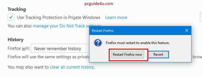 Step 3. The moment you select Never remember history, you may get a prompt to restart in order to apply these changes.