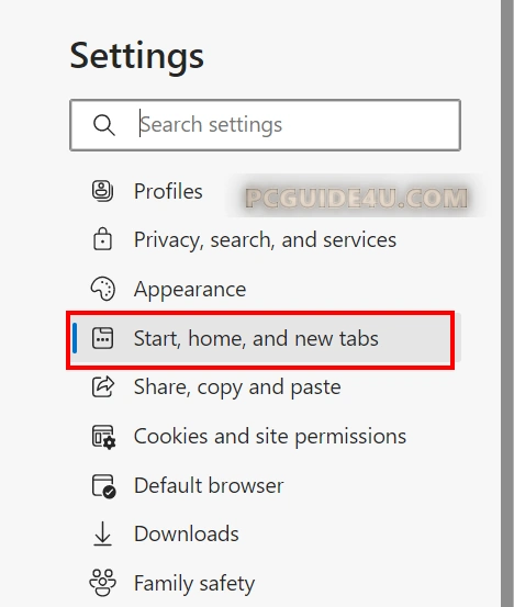 Step 2. On the Settings Page, from the left panel click on Start, home, and new tabs and you will see options on the right side.