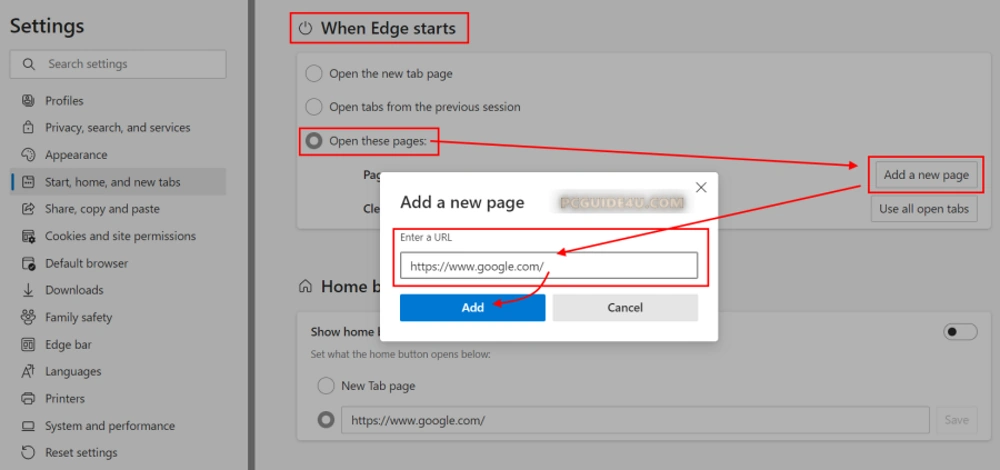 “Add a new page” window will appear on your screen. Type in your desired webpage or URL that you want to see when you launch the Edge browser.