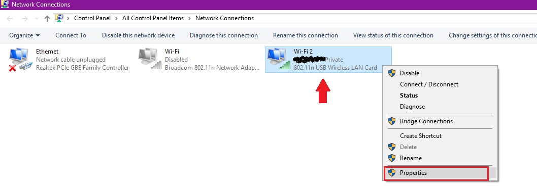 Step 2. The network Connections screen will be on your screen. Right-click on the connected WiFi network adapter and select Properties.