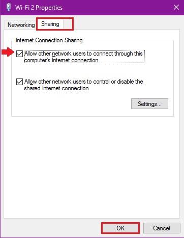 - Checkmark the box that says, Allow other network users to connect through this computer’s internet connection