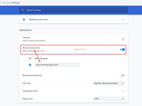 Step 2. The Google Chrome settings page will on your screen now. Scroll bit down and locate “Appearance” that contains few options and one of them is show home button.