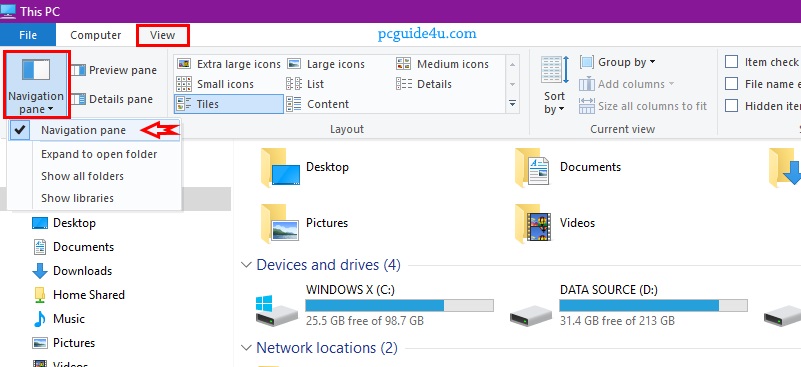 Step 2. Once the File Explorer opens, click on the View Tab (Alt+V) then, click on the Navigation Pane button in the ribbon. Click on Navigation pane.
