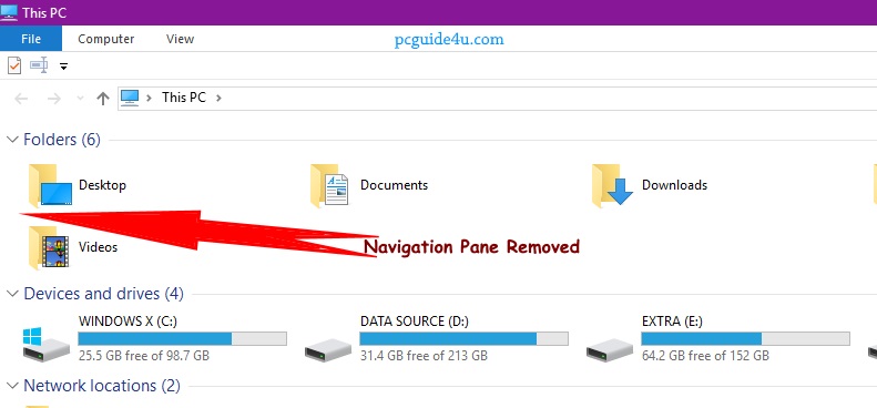 Check the below screenshot of the removed Navigation Pane in File Explorer.