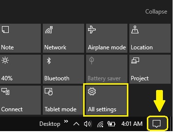 Step 1. Navigate to and click on the Notification Area in the bottom right corner of your computer screen and select All Settings or another option to open Windows 10 settings is to use the hotkeys Win + I.