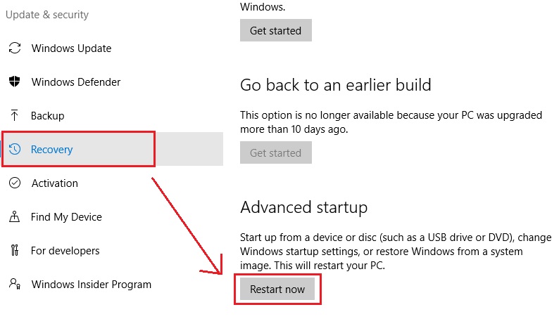 Step 3. Click on Recovery in the left pane of the window and hit on Restart now under Advanced startup.