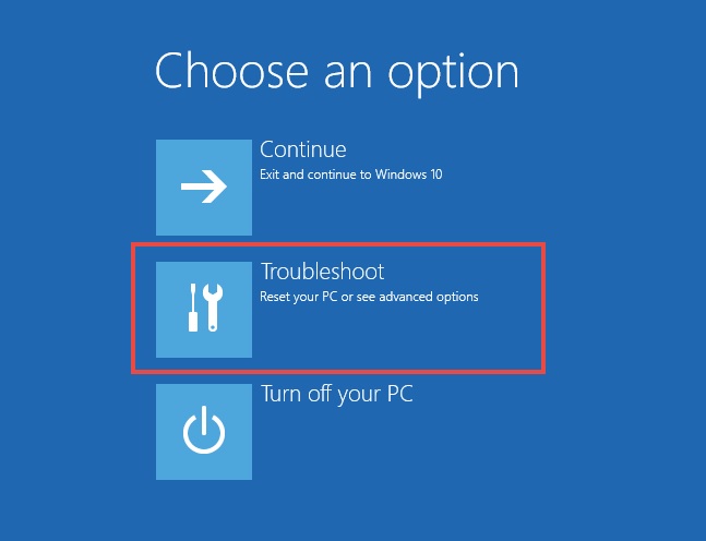 Step 4. By doing the above action, as a result, your PC will reboot and ask you to select an option. Then, choose Troubleshoot.