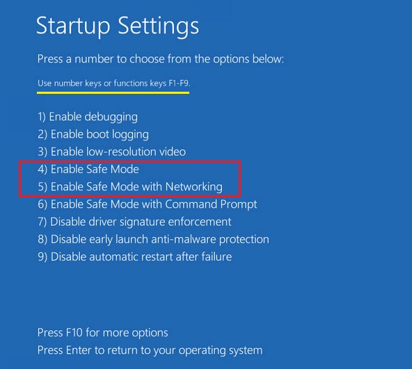 Select 5 or F5 for Safe Mode with Networking (if you need to use the Internet while on safe mode)