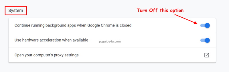 Step 3. Now, scroll down the page to the bottom and locate System. Underneath, turn off the option of “Continue running background apps when Google Chrome is closed”.