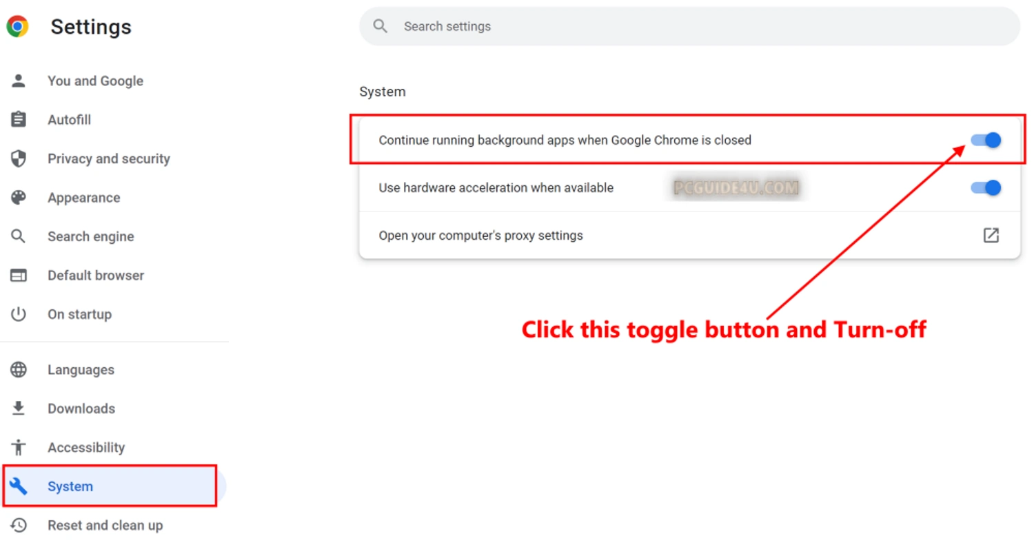 Step 4. Finally, look at the right-side options and turn off the option “Continue running background apps when Google Chrome is closed” using toggle button.