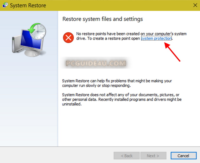 For some reason if system protection is not turned on then, you won’t either able to restore you Windows and you will see an error as shown in the below screenshot: