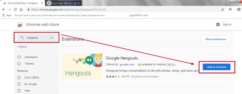 3) Navigate there, type hangouts in the search, and hit Enter button. The Chrome web store will show you the result in the right side.