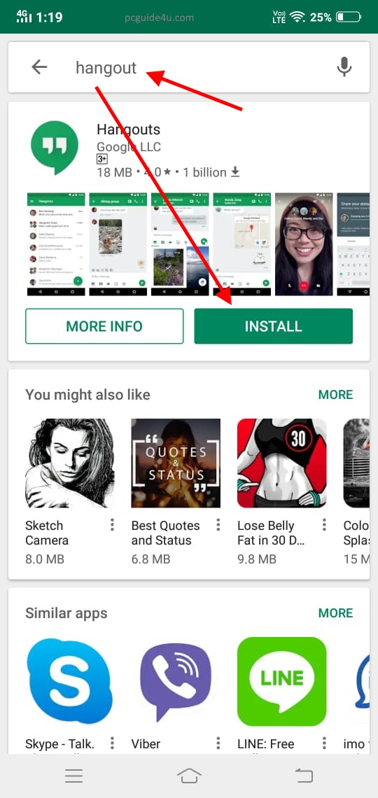 Go to the Play Store and search for ‘hangouts’ app. Once you will see the search result, hangouts will be there on screen. Click on “Install” button and it will be on your Android device. Sign in with your user ID and password and start using it.