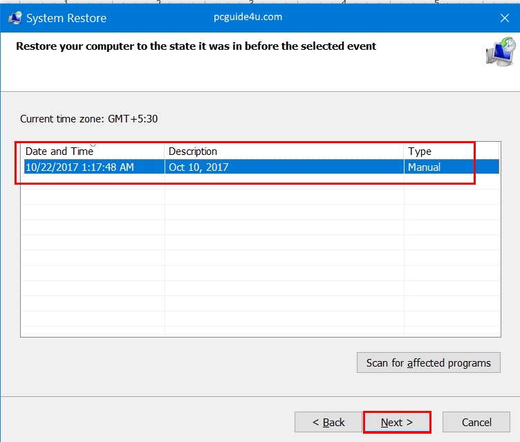 Select one of from the given list in which your computer is running fine and then click Next to continue.