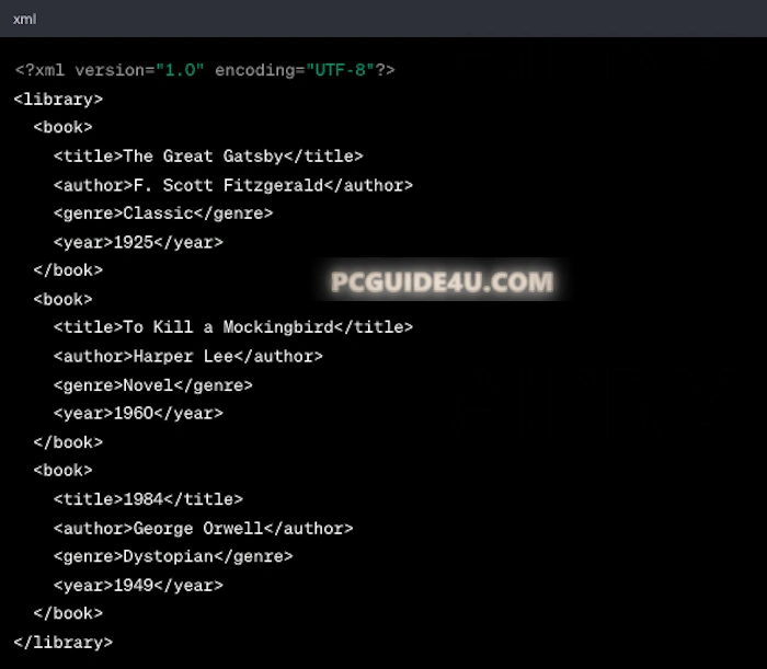 In this above XML example, we have a <library> element that contains multiple <book> elements. Each <book> element has child elements like <title>, <author>, <genre>, and <year> to store information about each book.