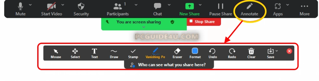 Zoom’s Annotate tools let you highlight, draw, or stamp – making it easier to point out details:
