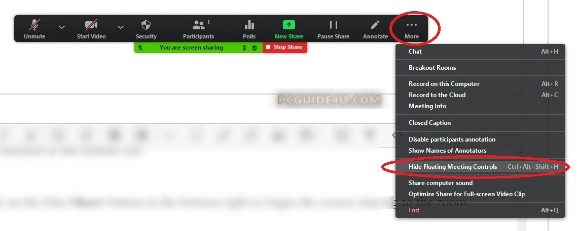- Or, manually select “Hide Floating Meeting Controls” from the “More” menu.