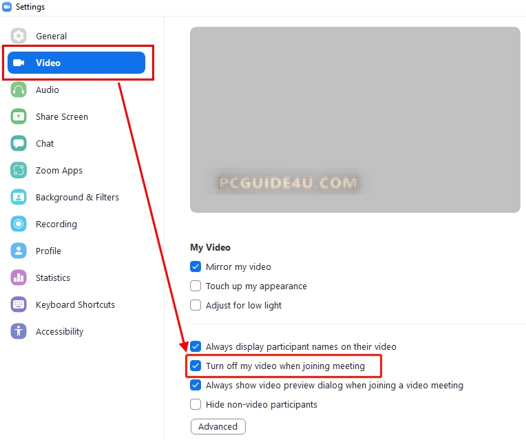 - Go to Zoom Settings > Video > “Turn off my video when joining a meeting.”